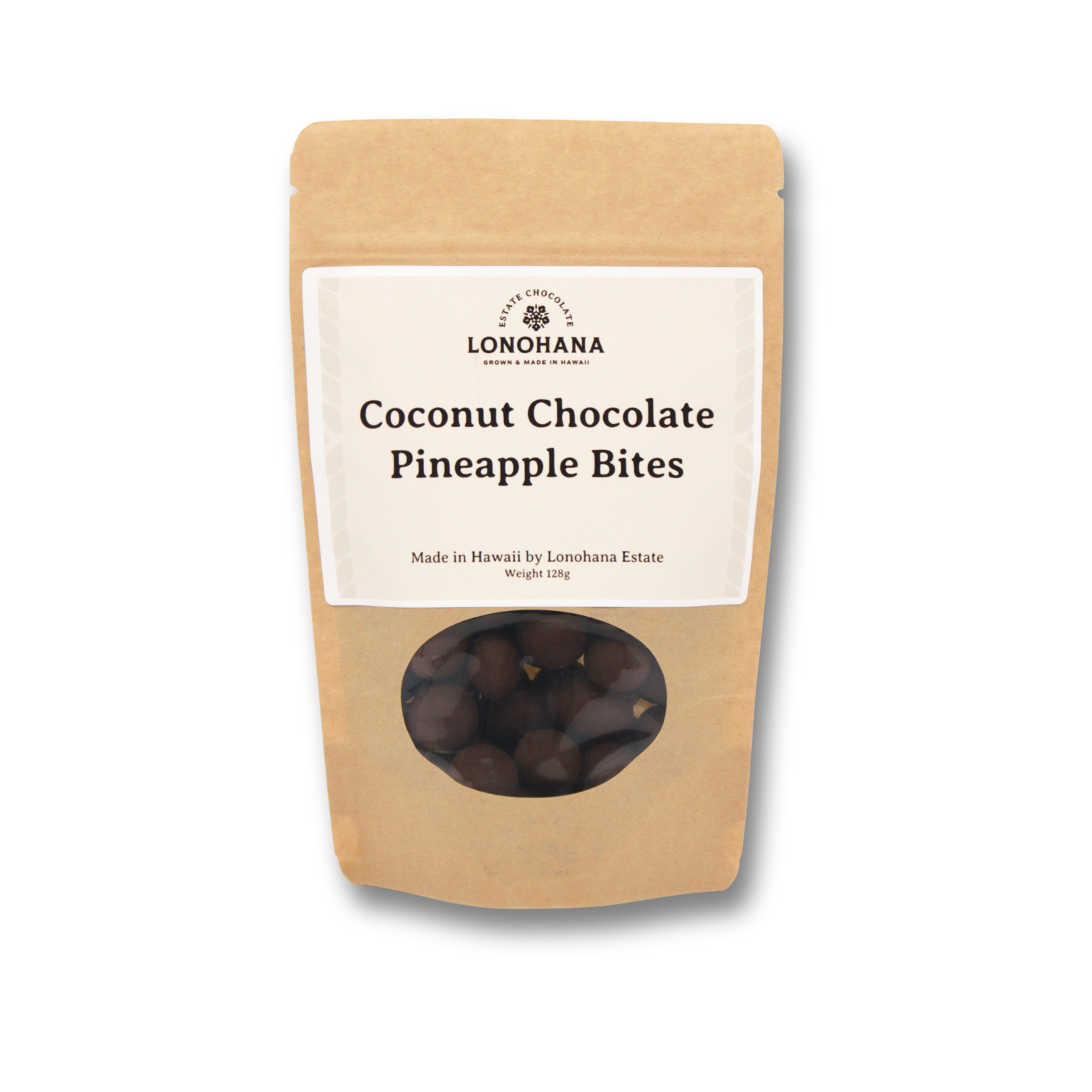 Ingredients: Hawaii-grown cacao, organic cane sugar, dehydrated organic coconut, organic cocoa butter, pineapple, sugar, citric acid. CONTAINS COCONUT
