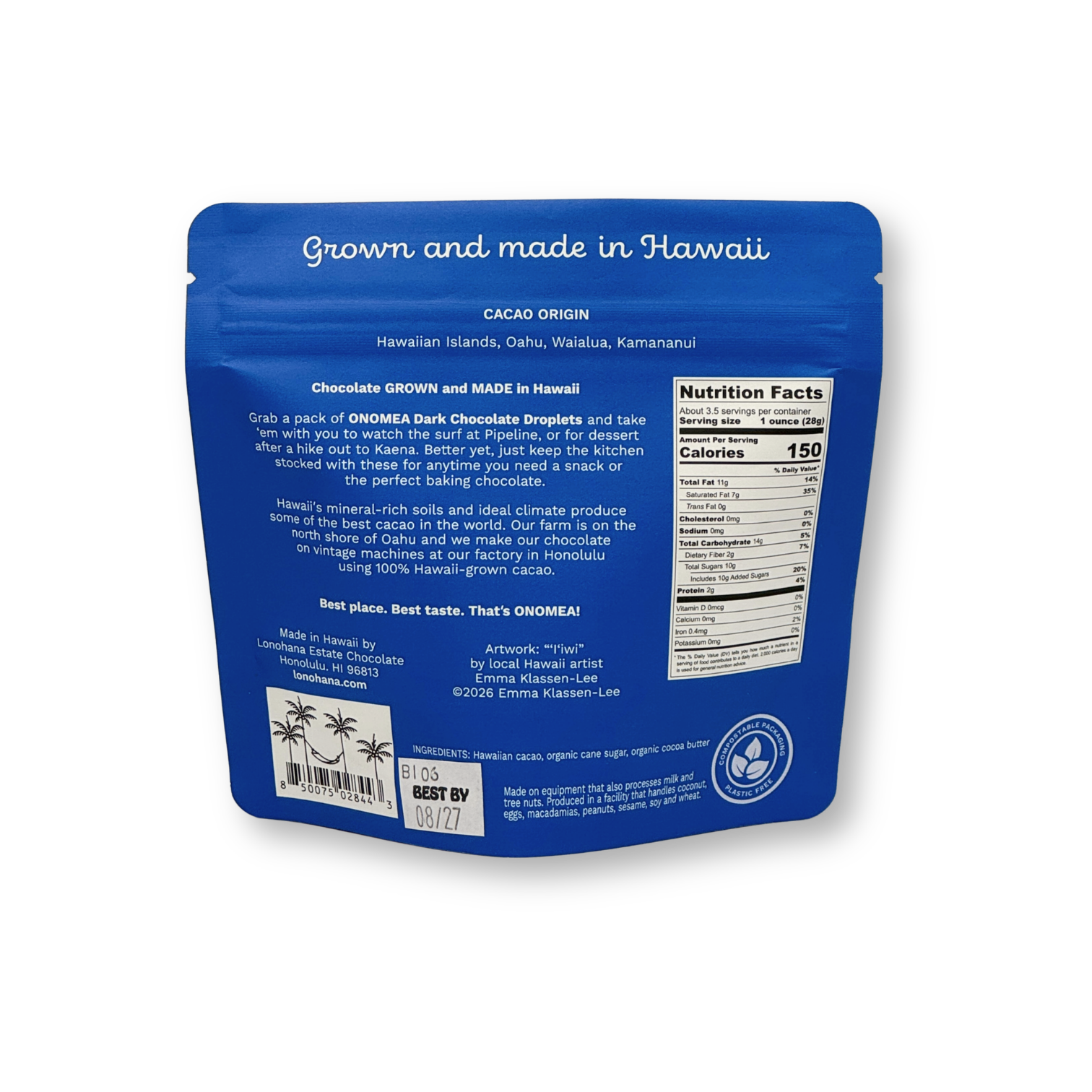 Grab a pack of ONOMEA Dark Chocolate Droplets and take ‘em with you to watch the surf at Pipeline, or for dessert after a hike out to Kaena. Better yet, just keep the kitchen stocked with these for anytime you need a snack or the perfect baking chocolate.