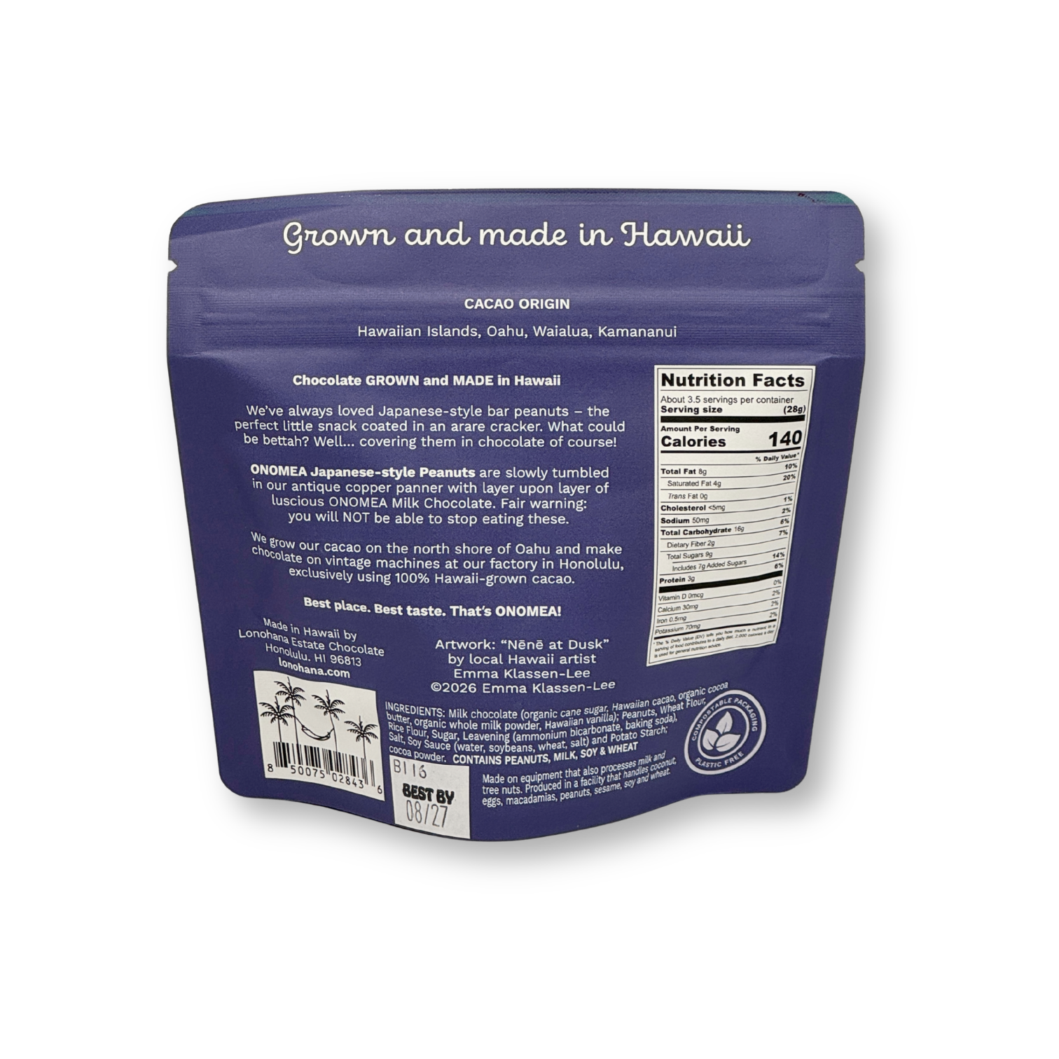 INGREDIENTS: Milk chocolate (organic cane sugar, Hawaiian cacao, organic cocoa butter, organic whole milk powder, Hawaiian vanilla); Peanuts, Wheat Flour, Rice Flour, Sugar, Leavening (ammonium bicarbonate, baking soda), Salt, Soy Sauce (water, soybeans, wheat, salt) and Potato Starch; cocoa powder. CONTAINS PEANUTS, MILK, SOY & WHEAT
