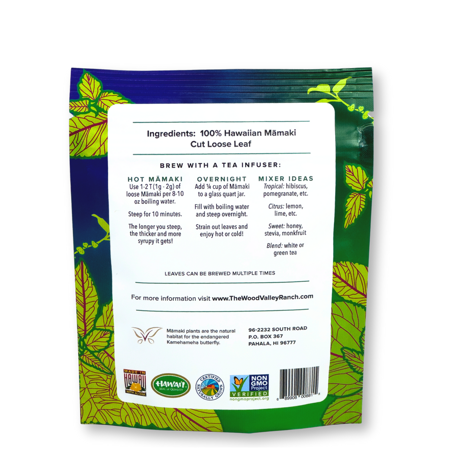 Ingredients: 100% Hawaiian Mamaki Cut Loose Leaf