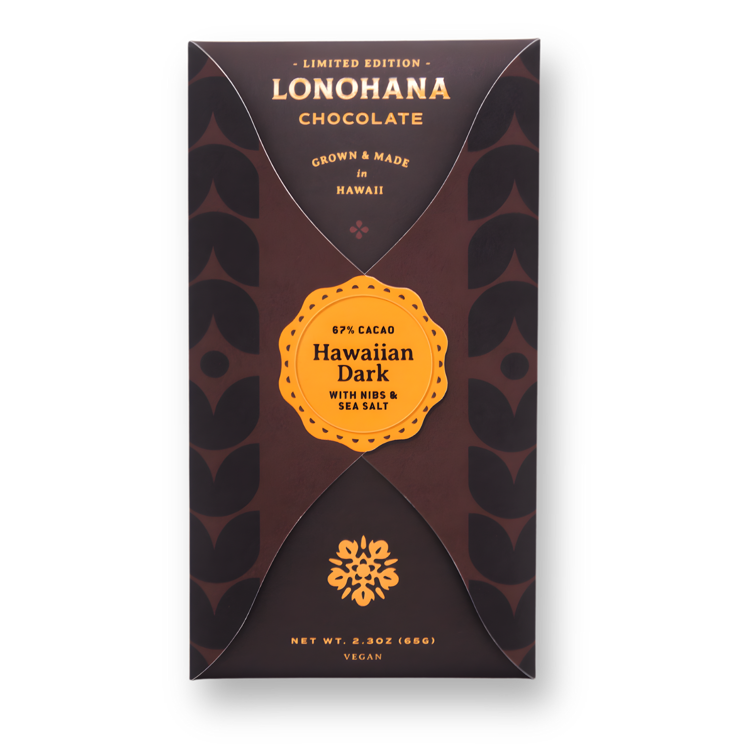 Hawaiian Dark with Nibs & Sea Salt (67%): One of our most popular bars, everything about this chocolate is Hawaii-grown at its best. We sprinkle alaea sea salt from Molokai and gently roasted Hawaii-grown cacao nibs on the back of our 67% dark chocolate. A menagerie of sweet and salty, creamy and crunchy this is a perfectly balanced and addictive chocolate bar.