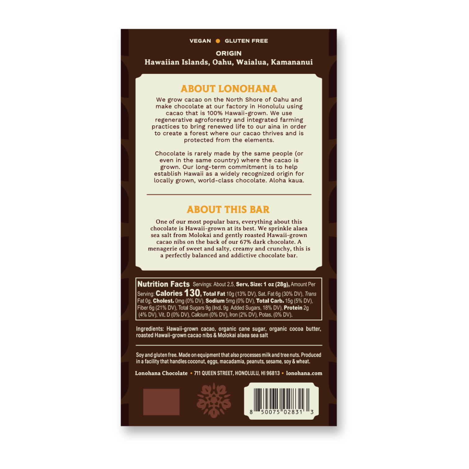 Ingredients: Hawaii-grown cacao, organic cane sugar, organic cocoa butter, roasted Hawaii-grown cacao nibs & Molokai alaea sea salt