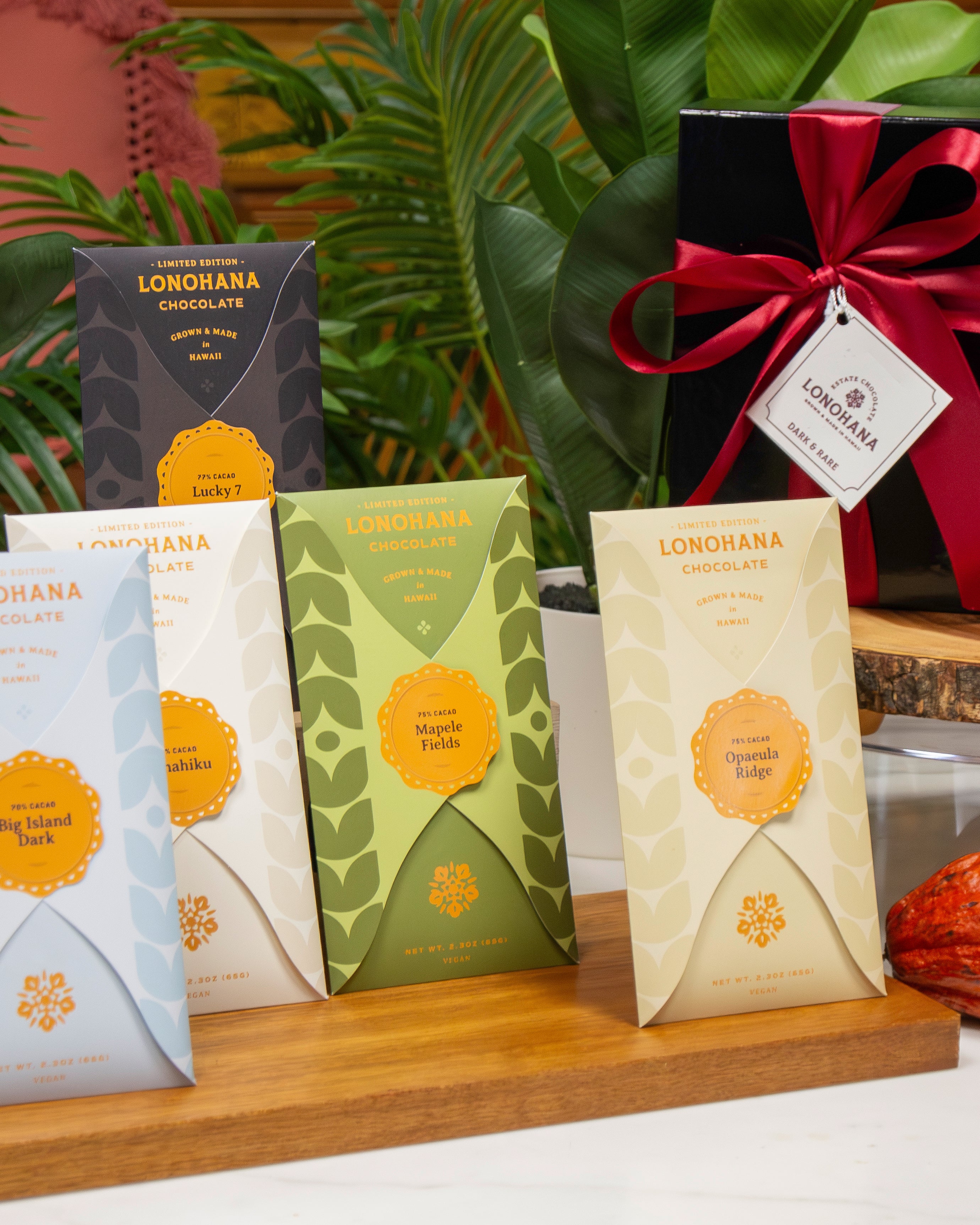 Our darkest and rarest chocolate bars all together and available while supplies last. This is a true exploration into the diverse terroirs of Hawaiian chocolate representing cacao grown on three farms, from two islands and in three perfect percentages.