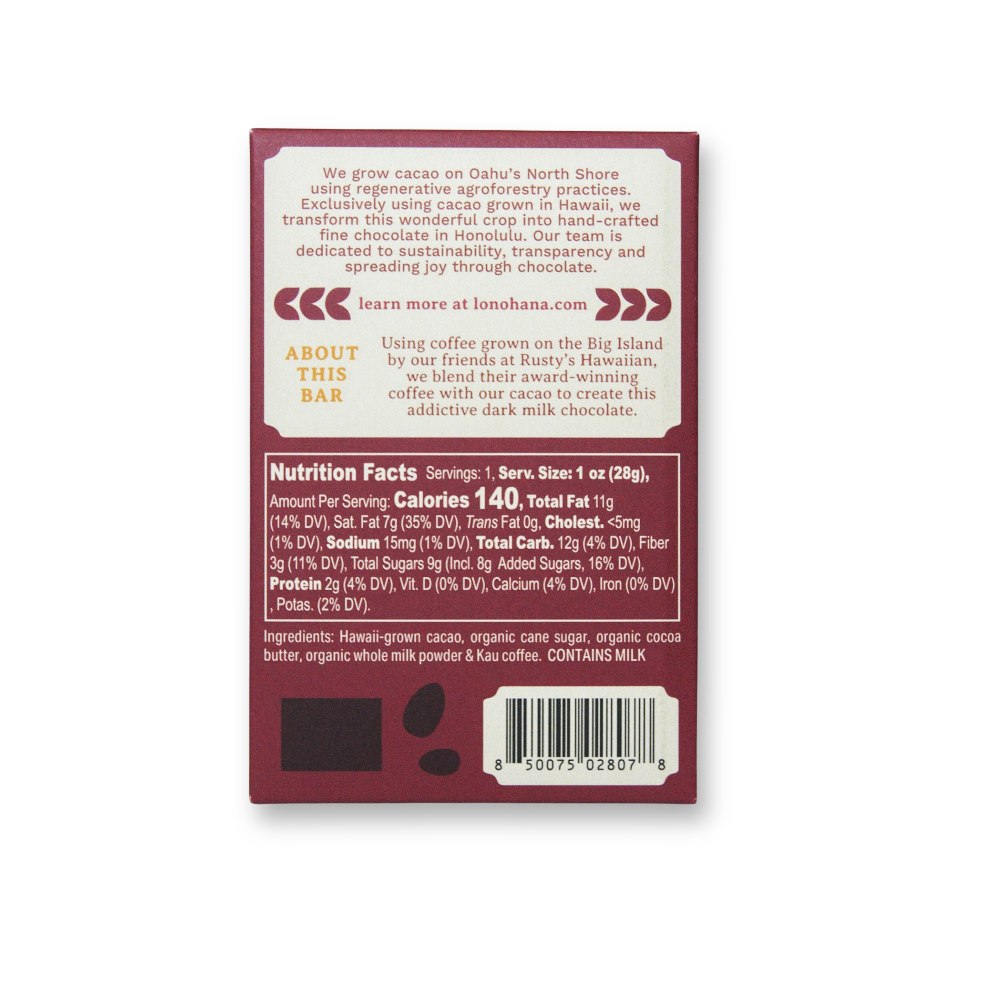 Ingredients: Hawaii-grown cacao, organic cane sugar, organic cocoa butter, organic whole milk powder & Kau coffee. CONTAINS MILK