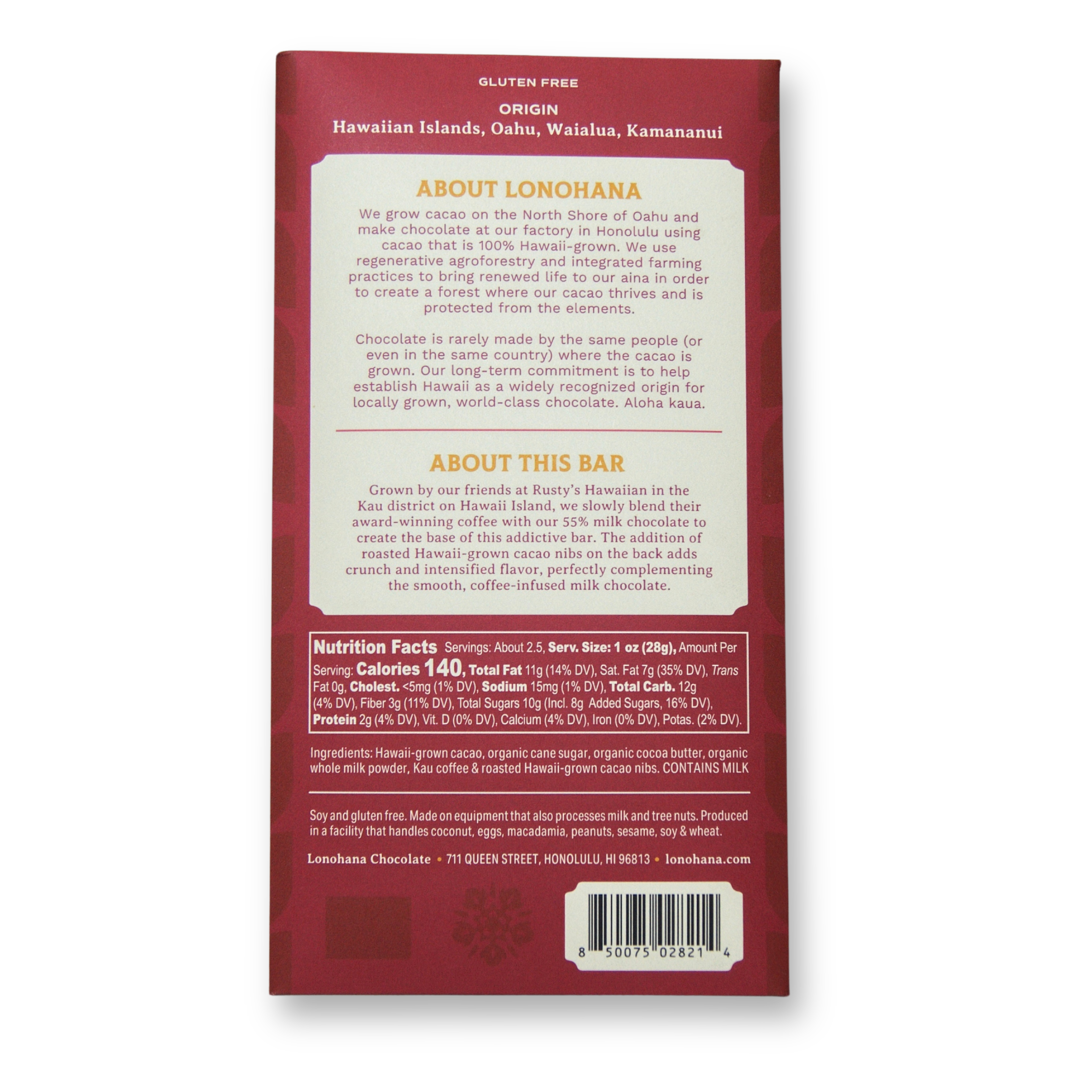 Ingredients: Cacao, organic cane sugar, organic cocoa butter, organic whole milk powder, organic Ka’u coffee, cacao nibs
